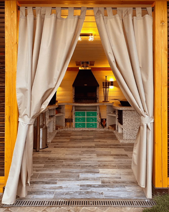 Люверсы, установленные на шторах с шагом 0,3 м, позволяют быстро установить и демонтировать теплый полог.